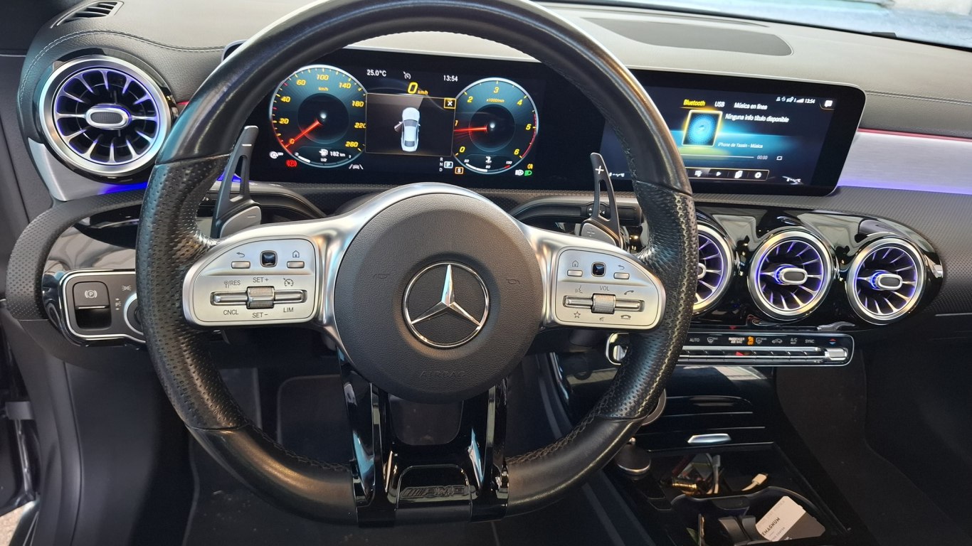 ABS, ESP, Control de Tracción TCS, Airbag de rodillas, Windowbags, Airbags frontales para conductor y acompañante, Control presión neumáticos, ATTENTION ASSIST, Airbag lateral para conductor y acompañante (airbag combinado de tórax y de cadera), Detector activo de cambio de carril, Llamada de emergencia Mercedes-Benz, Desconexión automática del airbag del acompañante, Servofreno de emergencia activo, Attention assist (Sistema de alerta por cansancio conductor), Asistente de frenado activo con función de girar, Cámara de marcha atrás, Elevalunas eléctricos delanteros y traseros, Sensor de lluvia, Función de parada y arranque ECO, Asistente para viento lateral, Cierre centralizado, Alfombrillas de velours negro con ribete en el color del equipamiento y distintivo «Mercedes-Benz», Función de arranque KEYLESS-GOSERIETEMPOMAT con limitador variable de velocidad, Freno anticolisión múltiple, Símil de cuero ARTICO /Tela Fleron, Apoyabrazos abatibles en consola central para conductor y acompañante, Caja de enchufe de 12 V en el compartimento portaobjetos, Iluminación del compartimento de carga (maletero), Portavasos doble, Portavasos doble y guantera (sin cerradura), Símil de cuero ARTICO / tela Bertrix negro (311A), Dirección directa, Paquete de alumbrado y visibilidad, Símil de cuero ARTICO /Tela Fleron, Símil de cuero ARTICO /Tela Fleron, AMG Line, Listones de umbral con distintivo Mercedes-Benz, Tirefit con compresor para inflado de los neumáticos, Elementos de adorno con efecto carbono, 8G-DCT cambio automático de doble embrague, Llantas de aleación de 45,7 cm (18′) y 10 radios dobles color negro brillante y pulidas, Compartimento de gafas para conductor, DYNAMIC SELECT con los programas de conducción ECO, Comfort, Sport e Individual, Guantera con cerradura, Airpanel, Faldón trasero de dos piezas con sección inferior destacada en efecto difusor color negro mate, Faldones laterales del color de la carrocería, Línea Progressive, Cambio automático 8G-DCT, Eje trasero con multibrazo, Tren de rodaje de confort y altura rebajada, Parrilla de efecto diamante y pasadores en negro, lama individual pintada en color plata e inserto, Listón de adorno en la línea de cintura y en la línea de las ventanillas en cromo, Línea Progressive, Multimedia y AudioIndicador velocidad límite, Toma USB en el compartimento portaobjetos del apoyabrazos delante y 2 tomas USB (de carga), Módulo de comunicación (LTE) para el uso de los servicios Mercedes connect me, Preequipo para radio digital, Sistema multimedia MBUX; Connect 20 que incluye preequipo para navegación (355) y Touchpad (446), Radio digital (DAB), Indicación de estado de los cinturones de seguridad en el cuadro de instrumentos, Preequipo para Live Trafic Information, Preequipo para Car Sharing, Servicios de acceso remoto, Preequipo para entrega digital de llave (3 años de uso gratuito a partir de la fecha de activación